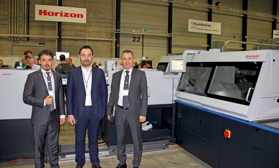 Aras Grup’un Türkiye temsilciliğini yürüttüğü Horizon’un standında Smart Binding System SB-09V 9 çene kapak takma makinesi, Smart Binding System kapak takma hattı, Horizon AFC-566FD katlama makinesinin yanı sıra yeni sistemler Horizon BQ-480 kapak takma makinesi (otomatik kitap bloğu beslemeli), Horizon AFV-566DF bobin çözücü sonrası katlama, StitchLiner mark III harmanlı ve tabaka beslemeli kitapçık hattı, Horizon Dijital Kapak Takma Sistemi sergilendi.